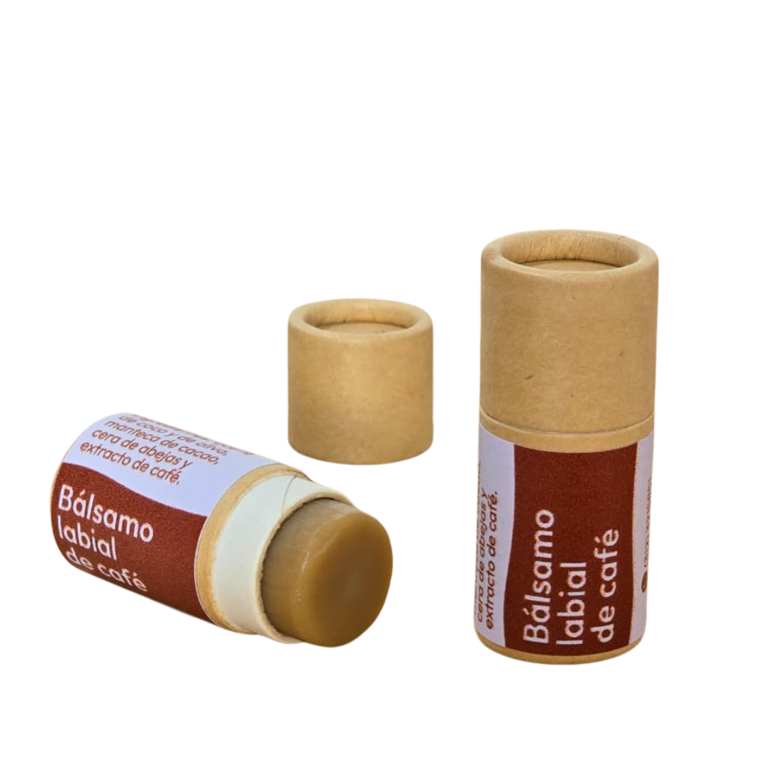 Bálsamo labial de café Madreagua, disfruta el sabor del café mientras hidratas tus labios naturalmente. Empacado en un envase biodegradable.